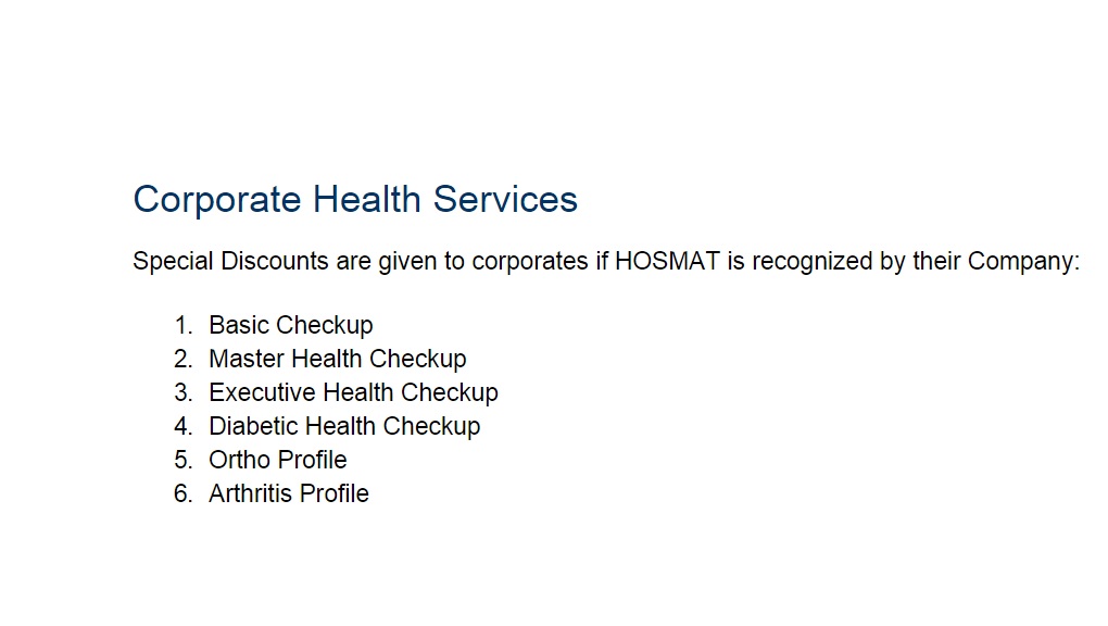 In the past ten years, HOSMAT has gained a reputation of being one of the best hospitals in orthopaedics and its subspecialities, joint replacement, arthroscopy, children's ortho, hand, spine, arthritis, Ilizarov, sports medicine and reconstructive surgery, Neurosurgery, and Neurology.